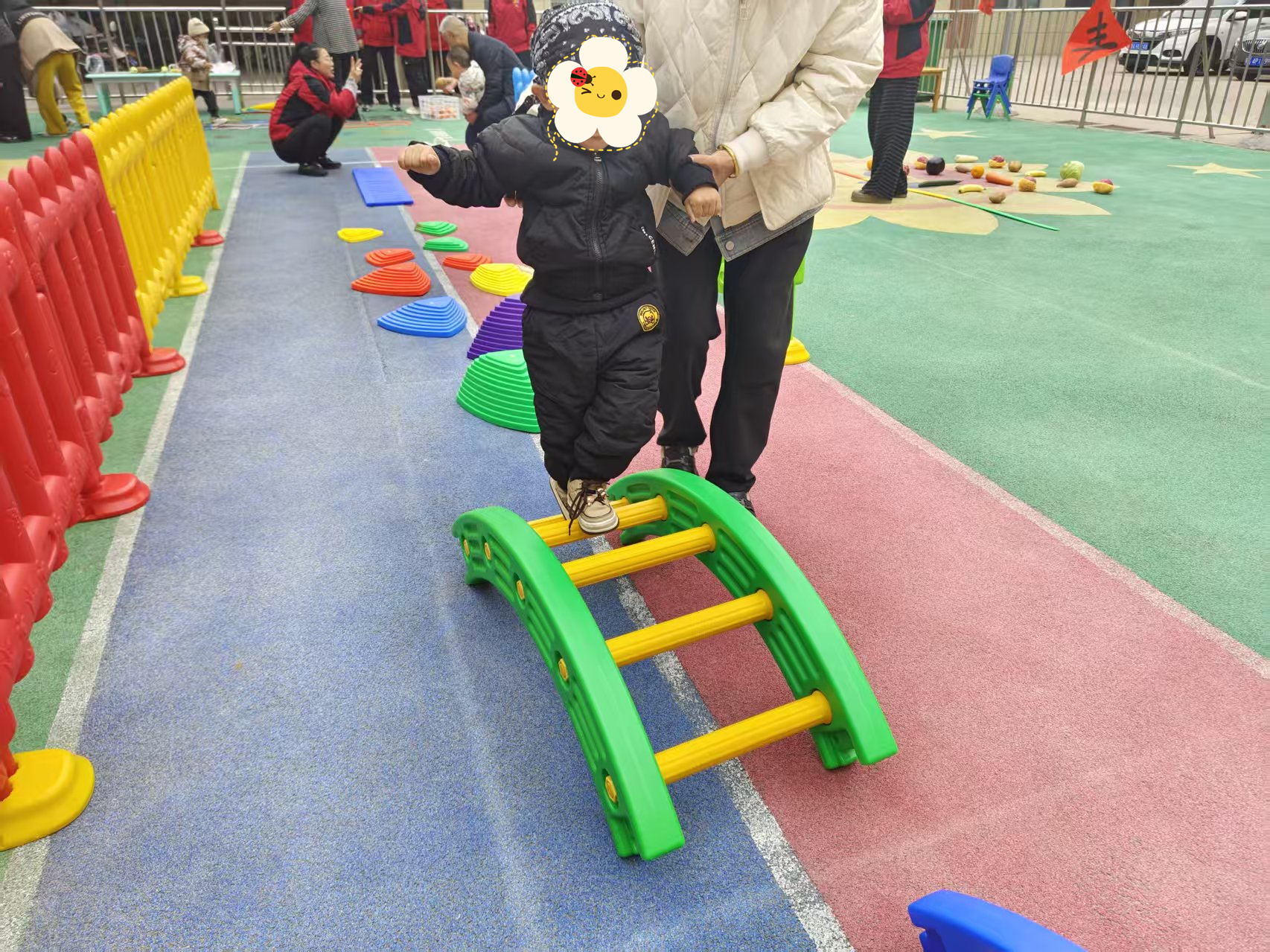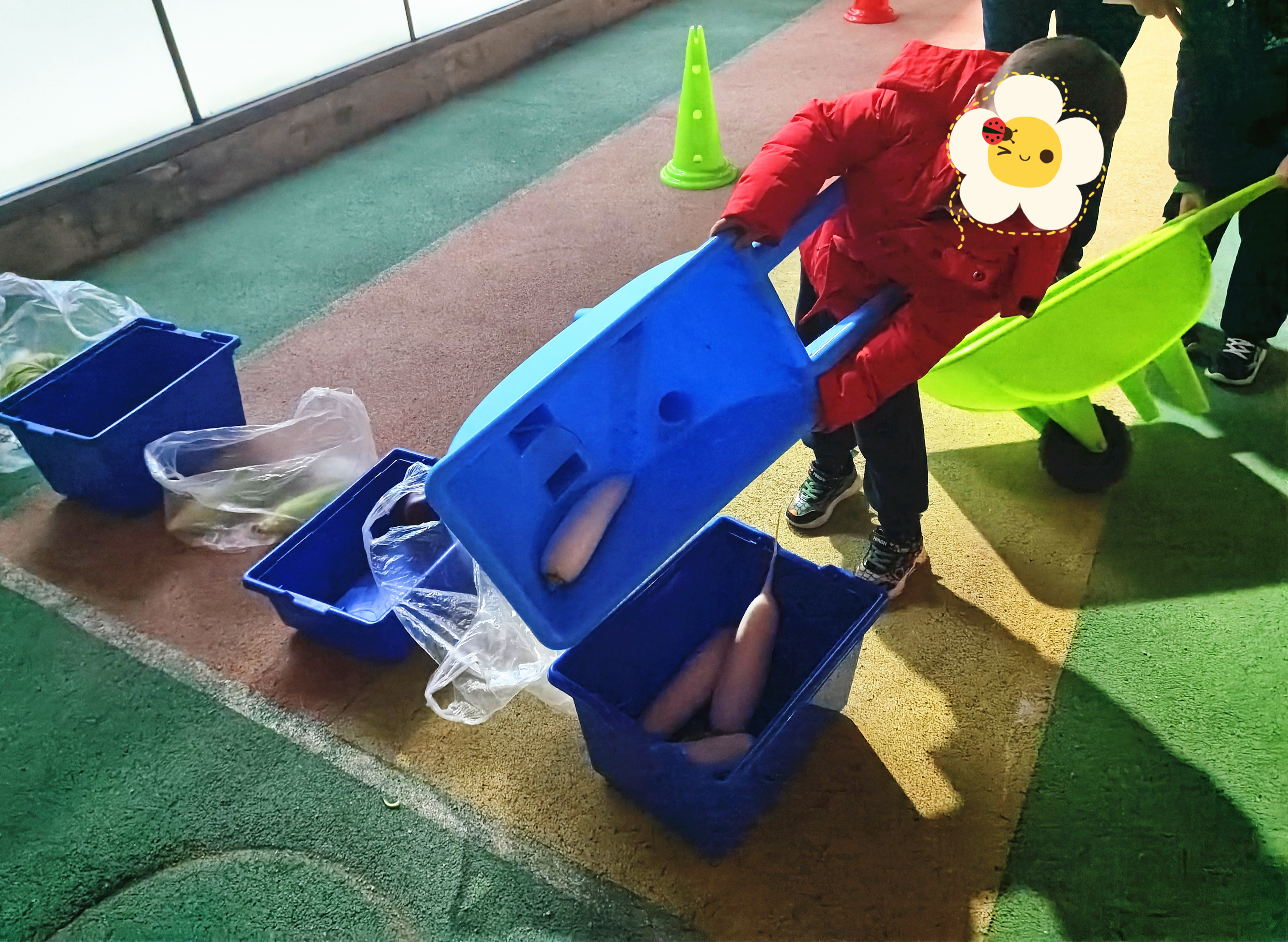 运动会共设置5大项目,粮食保卫战,需要孩子们认知玉米,茄子,黄瓜等常见蔬菜,并且推车把它们放在对应框内;刨土豆和萝卜大作战,需要孩子们穿越重重障碍,越过平衡步道,指压板,体能圈等器材,持续蹦跳、跨越、刨挖,排队,找到萝卜和土豆。