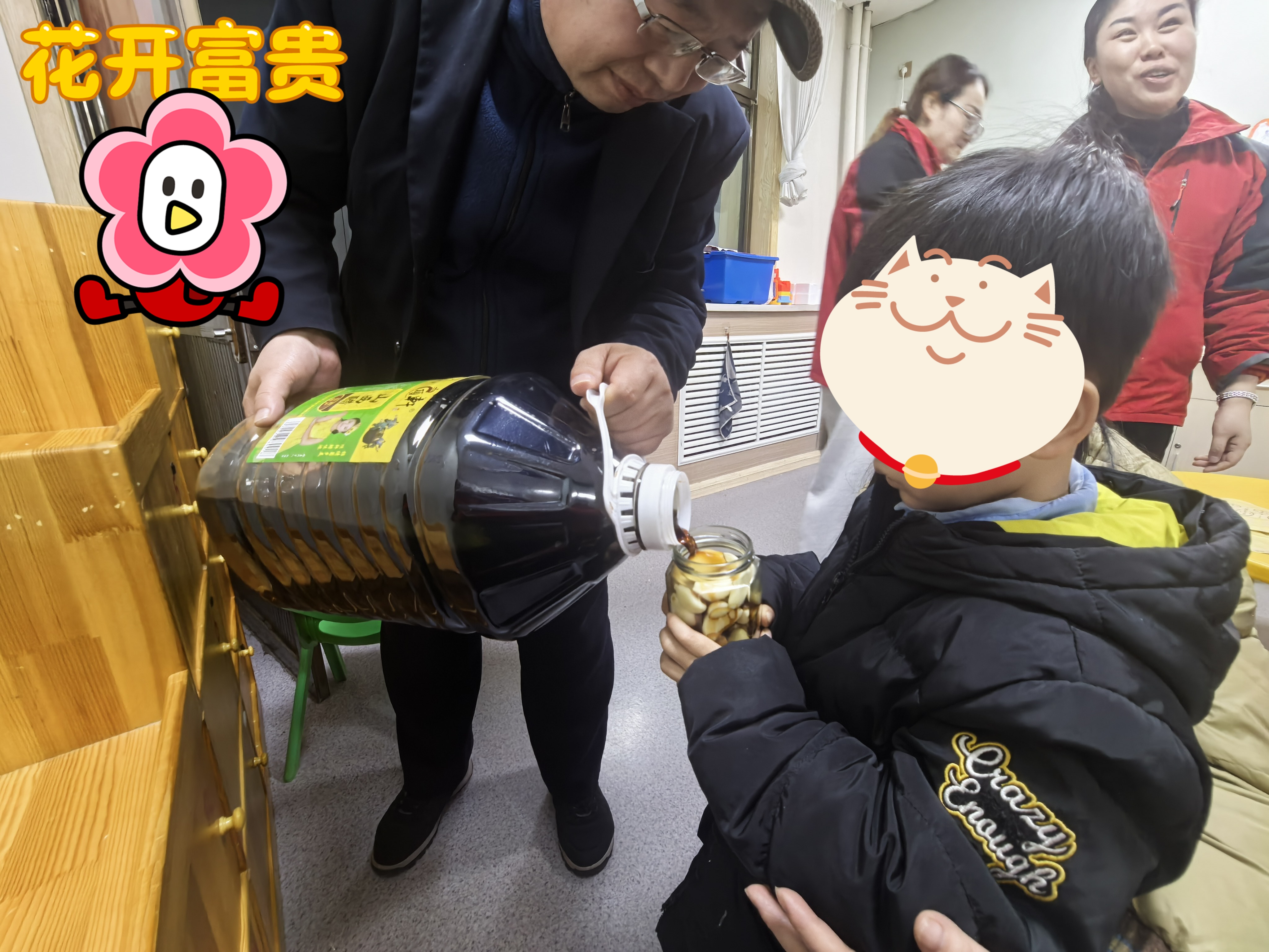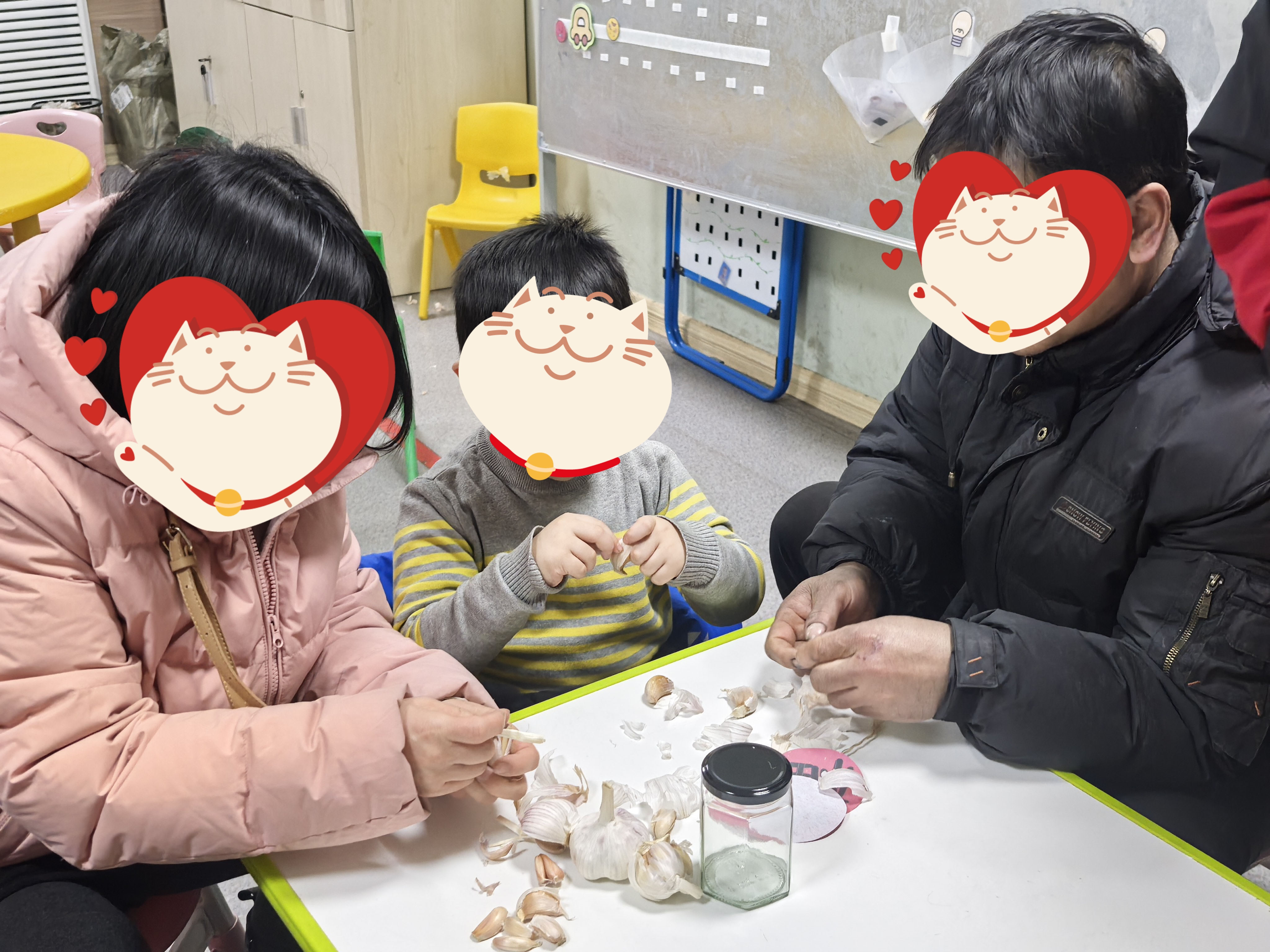 在腊八节,腊八蒜和腊八粥自然必不可少,孩子们自己尝试腌腊八蒜,观看流程示范,巧手扒蒜,积少成多,提要求帮忙倒醋封口,快乐实践,泛化技能!